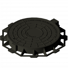 Tapa circular con marco articulado fabricada según NCH2080 provista de orificios para su anclaje. Además de 1 orificio para sistema de seguridad.